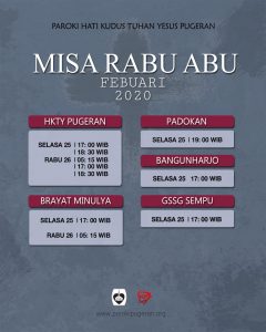 Dalam mengawali masa Pra-Paskah tahun 2020 ini, Paroki Hati Kudus Tuhan Yesus mengadakan Misa Rabu Abu di Gereja Induk maupun Gereja Wilayah dengan jadwal sebagai